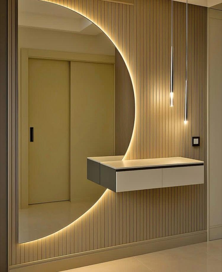 Gizli LED Aydınlatmalı Aynalar: Yarım daire veya tam dairesel formdaki büyük aynalar, kenarlarına gizlenmiş sıcak tonlu LED şeritlerle vurgulanmıştır. Bu aydınlatma, mekana derinlik ve zengin bir ambiyans katar.